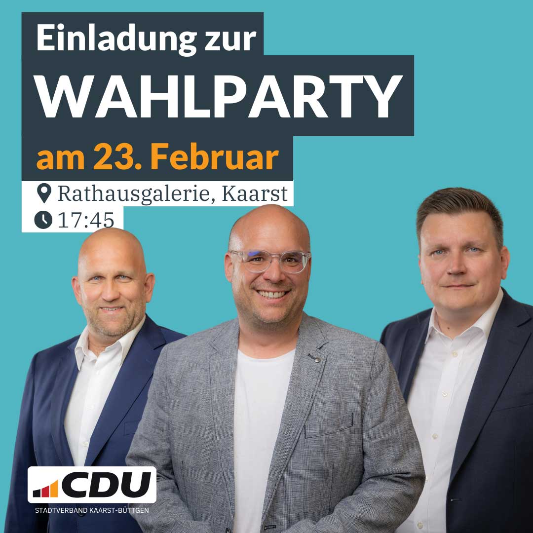 On 23 February 2025 the Kaarst CDU parliamentary group cordially invites you to spend the election evening together. Follow the first projections together with us, discuss the results and exchange ideas in a convivial atmosphere.